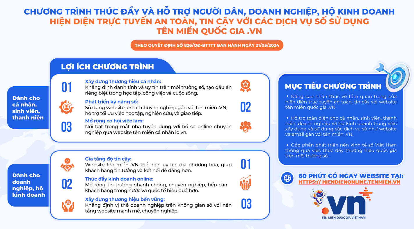 Ngày 21/5/2024, Bộ Thông tin và Truyền thông (Bộ TTTT) đã ban hành Quyết định số 826/QĐ-BTTTT phê duyệt “Chương trình thúc đẩy, hỗ trợ người dân, doanh nghiệp, hộ kinh doanh hiện diện trực tuyến tin cậy, an toàn với các dịch vụ số sử dụng tên miền quốc